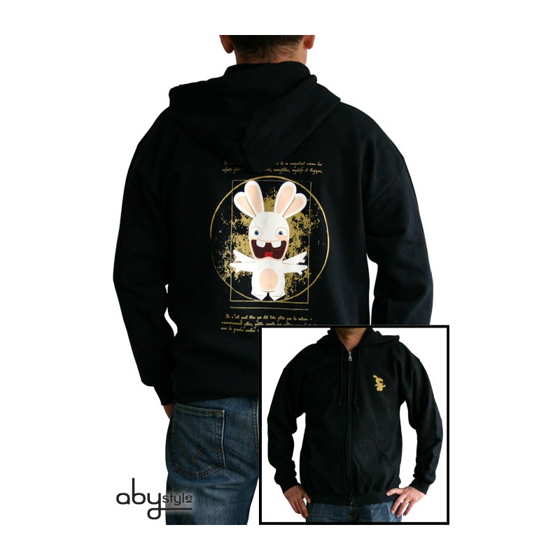 du t-shirt au sweat à capuches en passant par la casquette, la marque abystyle vous propose des vêtements fashion et sous licence !!!!collector : ce visuel du lapin crétin « vitruve » a été spécifiquement réalisé par ubisoft pour abystyle !!!!!- sweat-shirt zippé à capuche, poches kangourou, zip métal. modèle homme. disponible en 5 tailles: s, m, l, xl, xxl.- sweat noir d'excellente qualité: 50% coton/ 50% polyester. 270gr.
